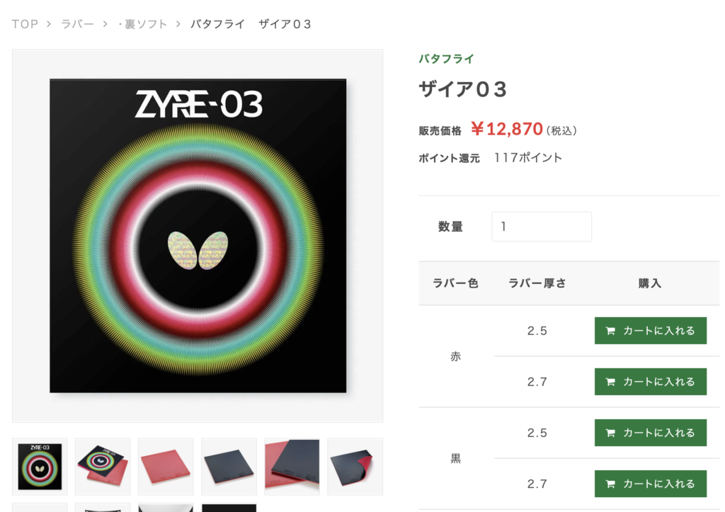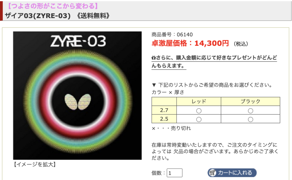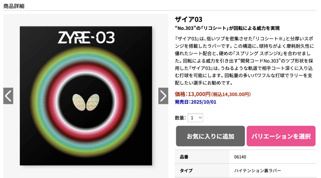 バタフライ公式サイトでは、ザイア03の定価は「オープンプライス」となっていますが、バタフライのオンラインショップでは14300円(税込)で販売されています。