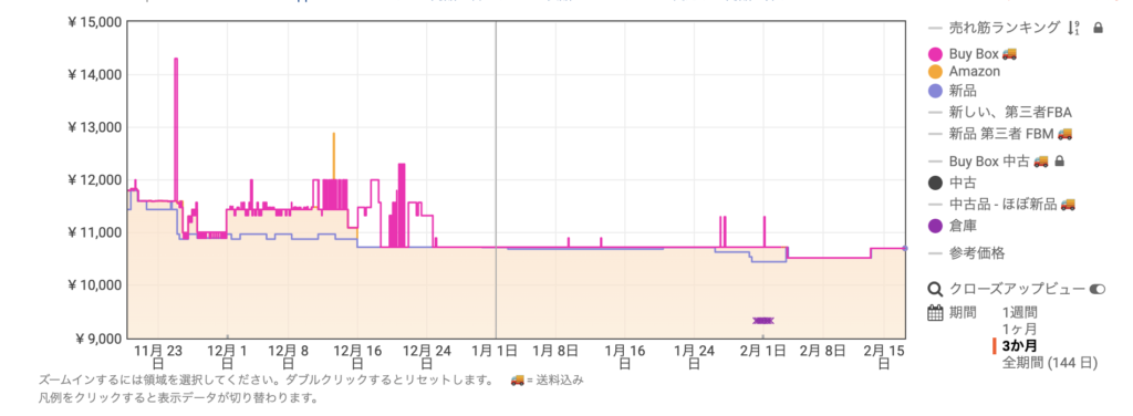 約3ヶ月間の平均販売価格も11000円を下回っているため、通常の販売価格で購入するより安く購入することができますね。