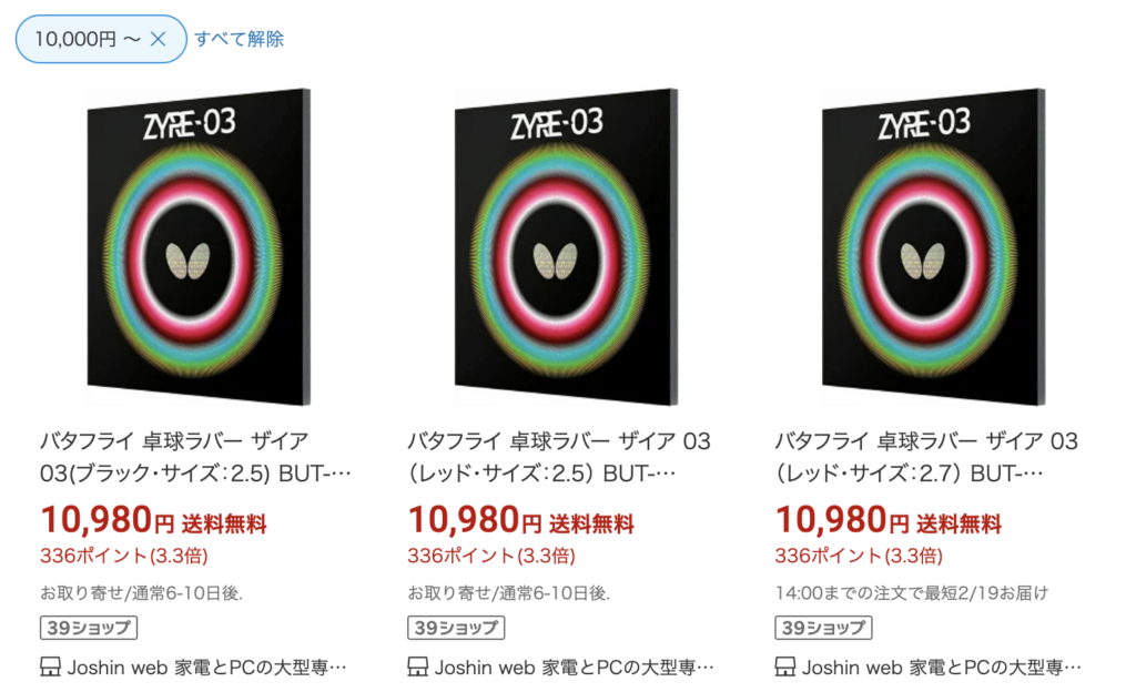 卓激屋の「ザイア03」の価格は14300円でした。バタフライオンラインショップと同じ価格でした。
